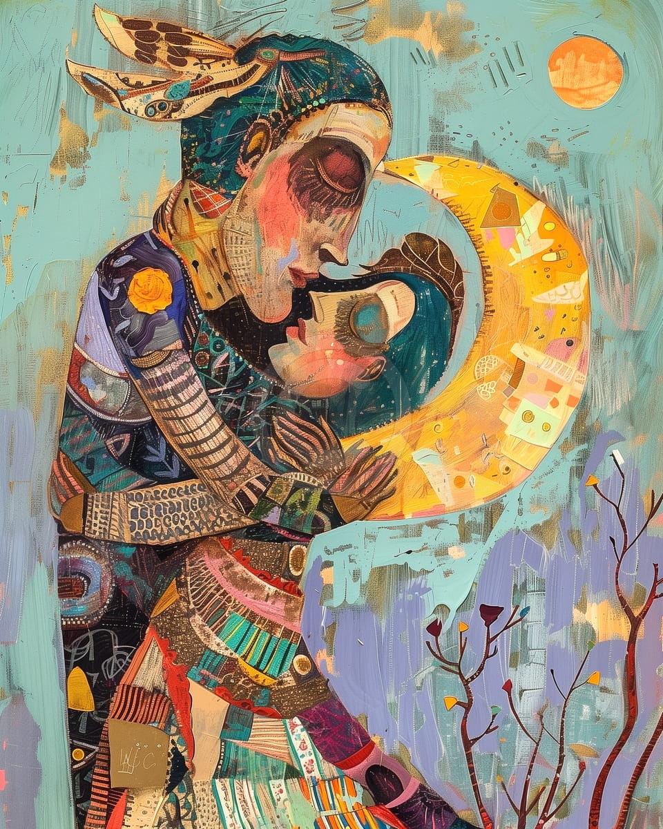 Dieses ausdrucksstarke Gemälde zeigt zwei Figuren in einer zärtlichen Umarmung unter einer leuchtenden Mondsichel. Die Figuren sind mit kunstvollen Mustern, Texturen und lebhaften Farben—Türkis, Gold, Rot und Erdtönen—verziert. Eine Figur hält die andere sanft, ihre Stirnen berühren sich in einem Moment tiefer Verbundenheit. Stilisierte und symbolische Elemente wie Vögel, abstrakte Geometrie und Himmelsmotive bereichern die Szene. Der Hintergrund zeigt einen traumähnlichen Himmel mit einer orangefarbenen Sonne oder einem Mond, der die magische Atmosphäre verstärkt. Die Komposition strahlt Wärme, Liebe und intime Einheit aus.