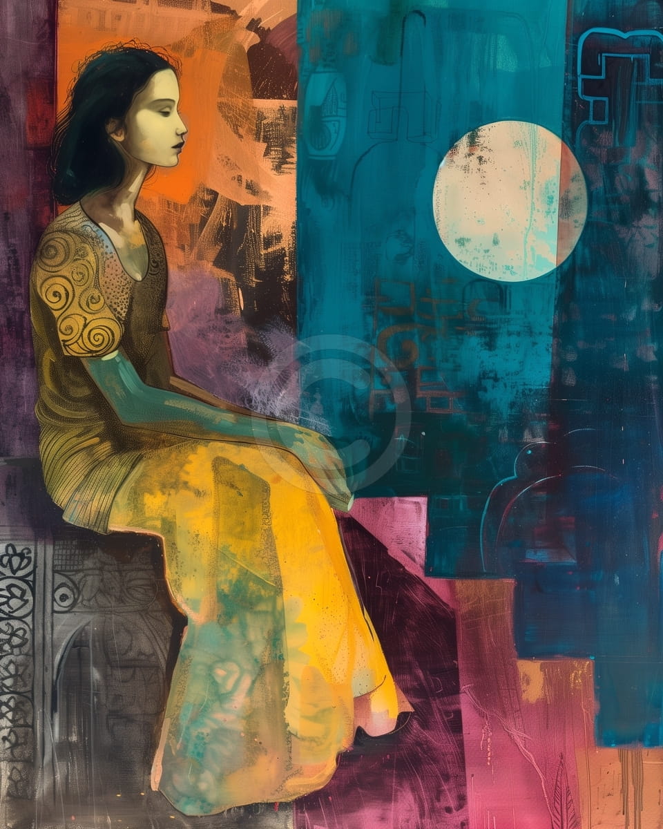 Dieses stimmungsvolle Gemälde zeigt eine nachdenkliche Frau, die vor einem vielschichtigen, abstrakten Hintergrund sitzt. Sie trägt einen fließenden gelben Rock und eine olivfarbene Bluse mit goldenen Spiralmustern; ihre Haltung ist ruhig und meditativ. Neben ihr leuchtet ein weißer Kreis—eine Andeutung des Mondes—auf einem tiefen Türkis. Der Hintergrund verbindet warme Ockertöne, Violett und kühles Blau in expressiven Pinselstrichen und sanften geometrischen Mustern. Das Werk vereint innere Ruhe mit einer träumerischen Atmosphäre.