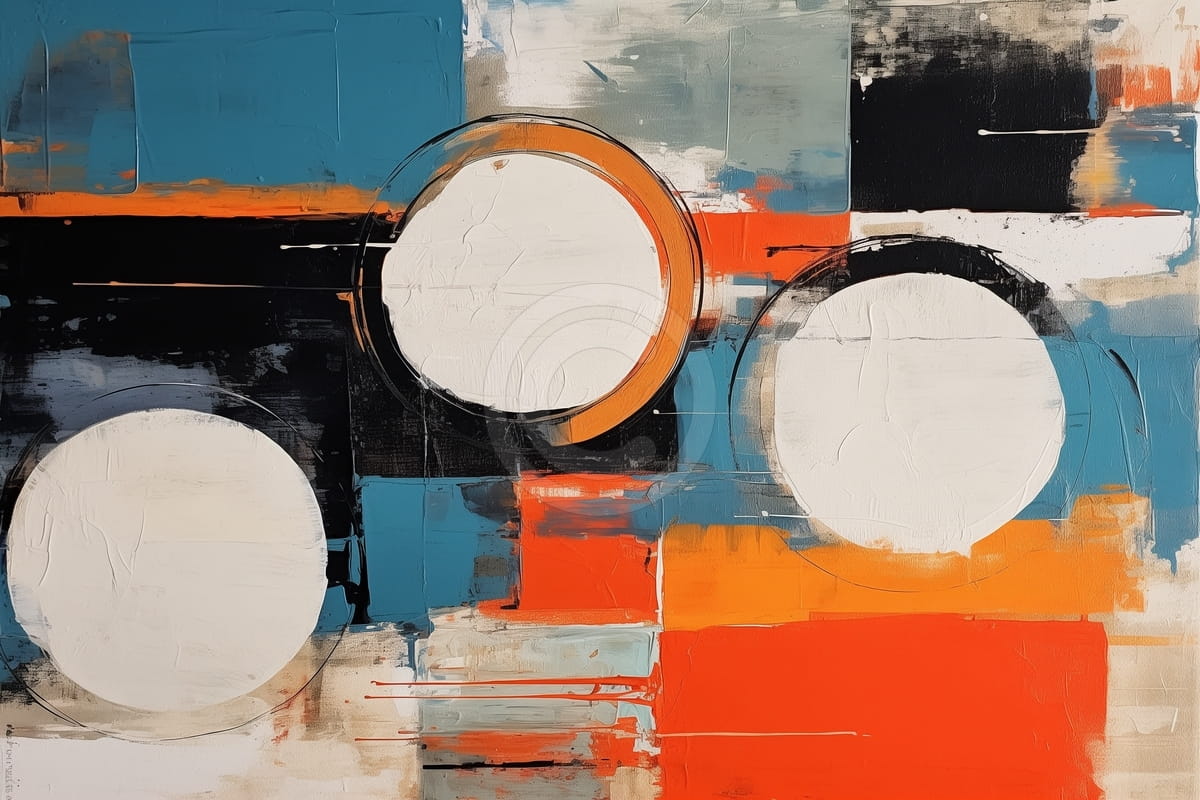 This painting presents three large white circles set against a bold abstract background composed of orange, black, teal, and gray blocks. The shapes are geometric and the textures are thick and layered, with visible brushstrokes and palette knife marks. The circles are outlined in black and orange, giving them contrast and depth. The composition is balanced despite its dynamic energy, blending structured forms with expressive color. It’s a visually engaging piece with a modern, urban feel.