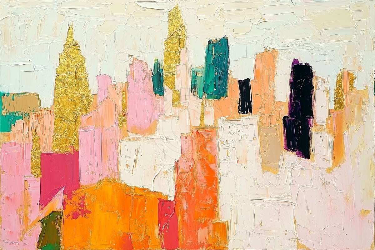 Ce tableau représente une ligne d’horizon urbaine stylisée, avec des coups de pinceau épais et une palette de couleurs vives. Des gratte-ciel abstraits dans des tons de rose, orange, or, vert émeraude, noir et blanc se dressent contre un ciel crème. Les bâtiments sont réduits à des formes géométriques, et des accents dorés illuminent la scène. La technique de l’impasto apporte de la texture et du relief, rendant la surface vibrante. La composition, à la fois énergique et harmonieuse, exprime l’essence de l’architecture urbaine avec fantaisie et dynamisme.