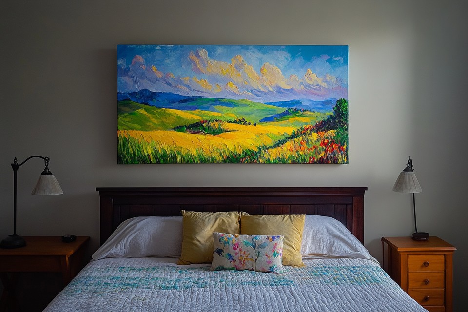 Un intérieur décoré avec des paysages abstraits mélange l’image de la nature avec un style artistique moderne. Ces œuvres montrent l’idée des paysages, comme les horizons, les champs ou les ciels, avec des formes expressives, des couches de matière et des couleurs modernes. Adapté aux espaces modernes, l’art de paysage abstrait apporte profondeur visuelle, mouvement et une énergie calme mais vivante dans les salons, chambres ou couloirs. Il crée une ambiance élégante et actuelle, transformant l’espace en un parcours visuel intéressant.