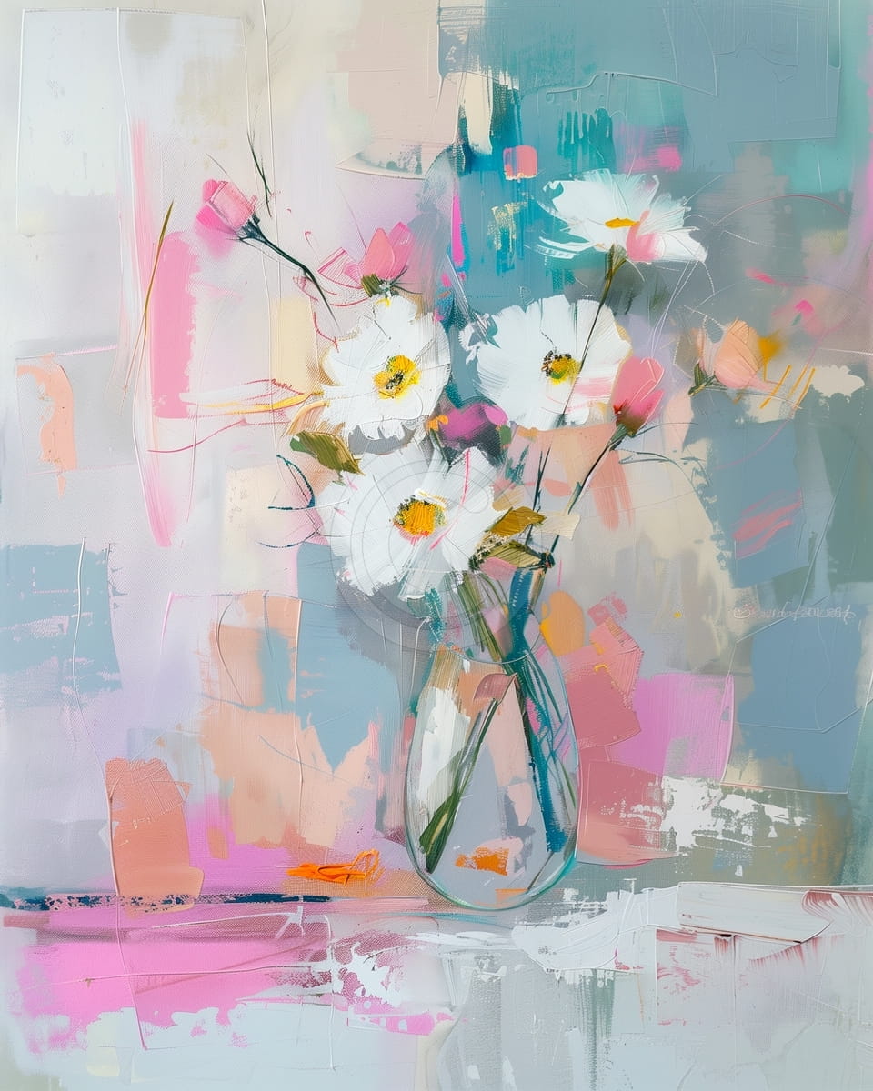 Questo quadro raffigura un mazzo di margherite bianche disposte in un vaso di vetro trasparente. I fiori hanno centri gialli e sono accompagnati da piccoli boccioli rosa e steli verdi. Lo sfondo è astratto e colorato, con una miscela di blu pastello, rosa, pesca e grigio tenue. L’artista usa pennellate materiche e una composizione libera per trasmettere freschezza e spontaneità. L’effetto complessivo è leggero, allegro e arioso.